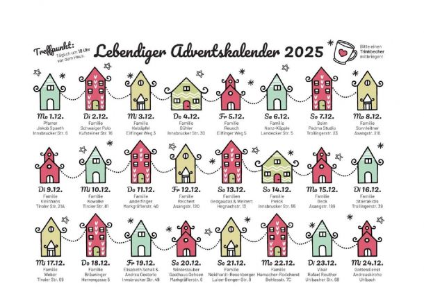 Vom 01. bis 24. Dezember Türchen öffnen und sich auf diese besondere Zeit freuen - das gefällt uns allen! Der lebendige Adventkalender startet am 01. Dezember um 18:00 Uhr vor dem Haus unseres Pfarre…