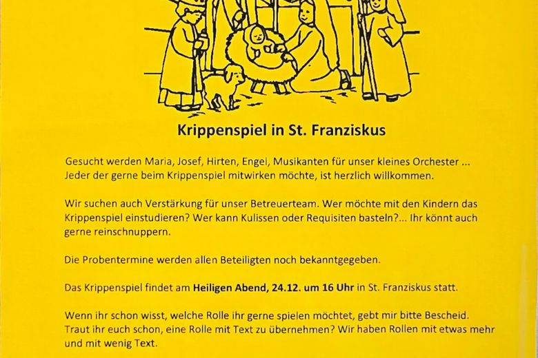 Liebe Eltern, liebe Interessierte, es werden verschiedene Helfer, Mitwirkende und Musizierende etc. für das Krippenspiel in St. Franziskus gesucht. Bitte melden Sie sich bis zum 10.11.2025 (auch bei Fragen) bei: