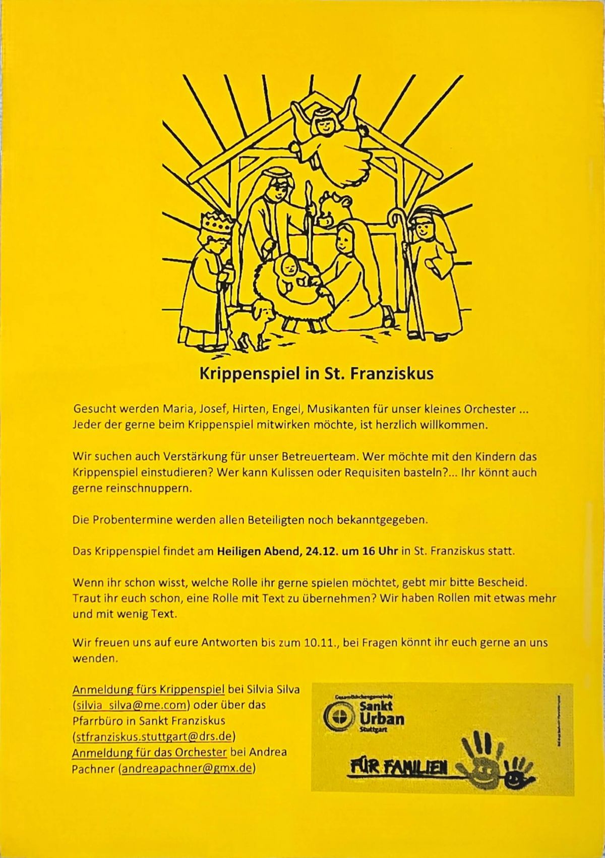 es werden verschiedene Helfer, Mitwirkende und Musizierende etc. für das Krippenspiel in St. Franziskus gesucht.