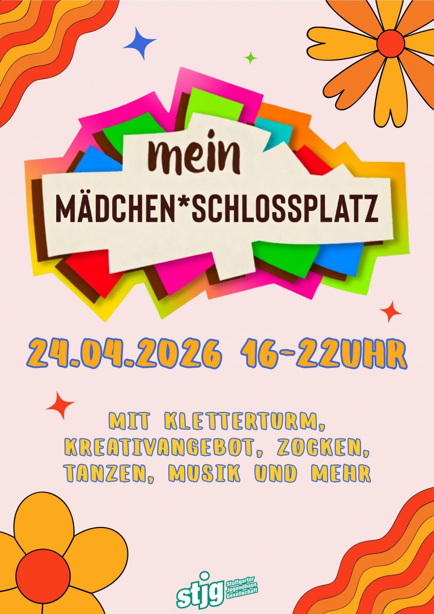 Am 24.04.2026 findet von 16 - 22 Uhr der MÄDCHEN*SCHLOSSPLATZ von der stjg statt.Die stjg freut sich über jede Teilnehmerin!